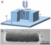 Figure 1. Plasmonic vertical nanocavity. (a) Schematic of a single nanocavity. (b) 30°-tilted SEM image of a representative cavity with length, width, and height of 360, 120, and 500 nm, respectively.