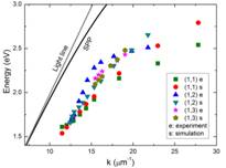 Figure 3. Experimental and calculated dispersions of plasmonic modes (1, 1), (1, 2), and (1, 3) in vertical nanocavities. The grey and black lines respectively represent the dispersions of light in a vacuum and SPPs on an infinite Ag film.