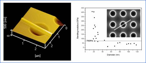 图1、银纳米线的杨氏弯曲模量随直径的关系: 左. 横跨在聚焦离子束加工的纳米孔阵列上的单根银纳米线的AFM形貌像;右. 利用AFM研究单根银纳米线的杨氏弯曲模量与直径的关系。插图对应为扫描电镜图像(经光银、段慧玲 等,Physical Review B,2006)。