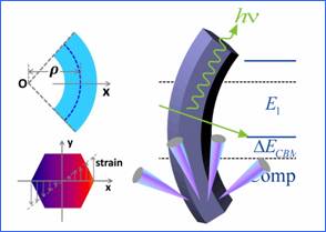 图3. 弯曲半导体纳米线/微米线中应力分布(上)、应变梯度的定义(下左),以及利用高空间、高能量阴极荧光(Cathodoluminescence Spectroscopy)光谱沿直径方向研究应变梯度效应的示意图(下右)。