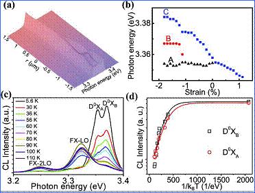 图2. 液氮温度线ZnO纳米线的近边发光峰能量与纳米线轴向应变分布的对应关系:a.弯曲成“L”状的ZnO纳米线沿轴向的应变分布随弯曲曲率半径的变化而不同,两个自由端无应变,中间曲率半径最小的区域应变最大,对应的发光峰能量、半高宽也随之变化(b,c);弯曲成“S”形的ZnO纳米线中(d)发光峰能量对应出现两次红移(韩晓冰 等, Advanced Materials 21, 4937,2009)。