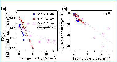 弯曲应变是一种非均匀应变,其最大特点是存在着线性的张-压应变梯度,该应变梯度被定义为弯曲曲率半径的倒数,它能够反应弯曲时应变的分布情况,如图3所示。电子束激发的阴极荧光光谱具有极高的空间/能量分辨本领,为研究应变梯度效应提供了可能。他们选择直径数微米的ZnO微米线,沿径向以100 nm的步长进行线扫描,可以采集到数十条系列阴极荧光谱线,能够精准地把不同应变梯度下应变对发光能量的调制作用揭示清楚。
