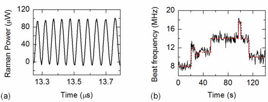 图2:(a),微腔拉曼激光的拍频信号;(b),拍频信号随时间的变化,拍频的台阶变化表示单个20 nm尺度颗粒的吸附