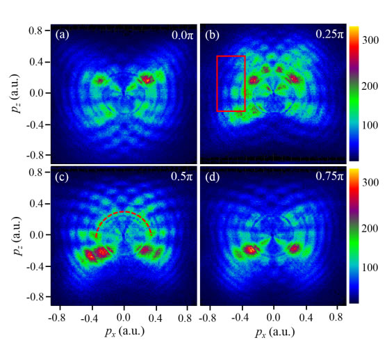 图2 实验上测量到的在不同相位的 0π(a), 0.25π (b), 0.5π (c), 0.75π (d).正交双色光场中光电子干涉图样