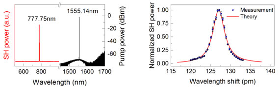 左图:实验获得的激发光和二次谐波光谱图;右图:动态相位匹配过程二次谐波功率变化。