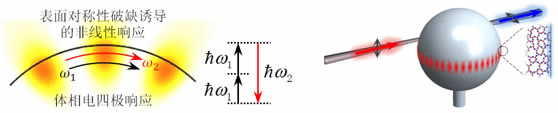 左图:表面二次谐波效应示意图;右图:光学微腔增强表面非线性效应。