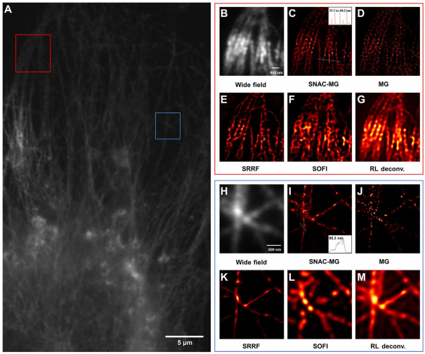 图3 QD625量子点标记的COS7细胞生物样品的主动控制超分辨重建图像