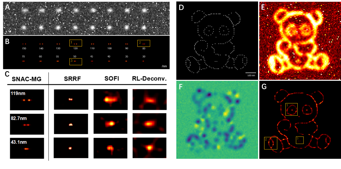 团队在ZnCdS量子点体系下获得衍射极限范围内各个量子点的差异化激发。通过设计多个整形脉冲,单个ZnCdS量子点的荧光差异性会得到增强。课题组通过周期性改变整形脉冲和傅立叶增强提取荧光响应的差异。同时,主动控制的图像采集方案可以有效的抑制系统中不随调制周期变化的泊松随机噪声和CMOS工艺导致的固定噪声,极大的提升了信噪比。接着,利用独立开发的混合周期(Combination-FFT)和多高斯拟合定位算法获得最终的超分辨重建结果。研究模拟了邻近双点荧光发射的超分辨定位,其结果可以很好的分辨出低至50nm的相邻荧光分子。对于密集标记的线性结构,SNAC的分辨能力同样有显著性的提高,获得了30nm左右的径向定位精度。在量子点标记的COS7细胞样品的维管结构区域清晰的观测到了维管的平行取向和姿态排布以及纤维交叉区域的95.3nm的邻近双峰,显示出了比已有多种宽场超分辨方法更好的重建结果。这个研究将脉冲整形作为新的控制维度引入荧光超分辨,并将宽场超分辨成像技术的分辨率提升到了与单分子定位方法接近的50nm的水平。