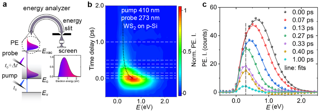 图5 WS2/hBN/p-Si样品时间和能量分辨PEEM测量,电子能量分布曲线可以由费米-狄拉克分布拟合。