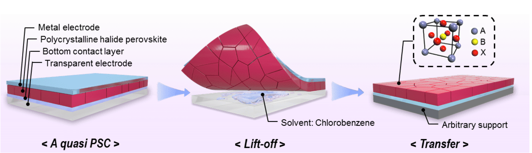 图2展示的是钙钛矿多晶薄膜无损剥离技术:将制备好的准钙钛矿太阳能电池器件浸泡到钙钛矿材料的反溶剂氯苯当中,底部聚合物传输层溶解将钙钛矿薄膜与透明基底分离;同时,顶部金属电极薄膜可以起到支撑骨架的作用,从而保证多晶薄膜完整地从玻璃基底上分离,最终首次得到了完整暴露的钙钛矿多晶薄膜底面。
