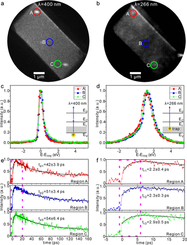 实验上,研究团队利用研制的飞秒时间分辨光电子显微系统(fs-PEEM),对无机钙钛矿CsPbBr3晶片进行时空特性研究(图1)。光电子成像系统可以探测超快时间、超小空间和能量分辨三个维度的信息。根据缺陷态对光电子波长的选择性,可明确识别出晶片内部局域的结构缺陷,以及晶体表面均匀分布的浅层缺陷。能量谱(图2a、b)显示了体内结构缺陷属于浅能级缺陷,而广泛存在于表面的则属于深能级缺陷。时间分辨表面光电子动力学的结果(图2c、d)则表明钙钛矿表面动力学由表面的特性控制,而内部结构缺陷对动力学(图2e、f)则几乎没有影响,即钙钛矿对结构的缺陷具有高容忍性。