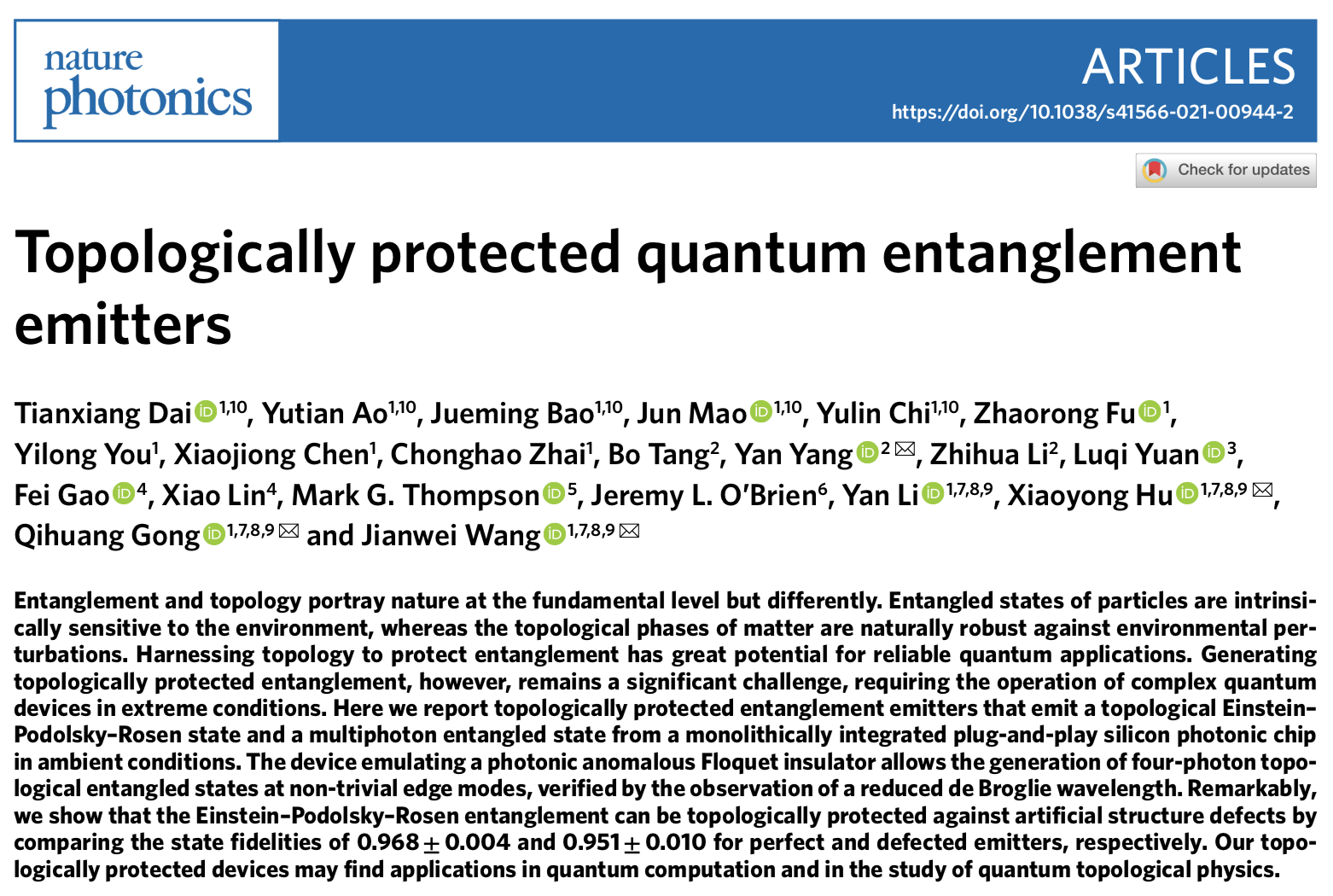 2022年2月17日,相关成果以“拓扑保护的量子纠缠光源”(Topologically Protected Quantum Entanglement Emitters)为题,在线发表于《自然·光子学》(Nature Photonics)。北京大学物理学院2019级博士研究生戴天祥、2017级博士研究生敖雨田、2018级博士研究生包觉明、2020级博士研究生茆峻、2019级博士研究生池昱霖为文章共同第一作者,王剑威、胡小永、龚旗煌与中国科学院微电子研究所杨妍研究员为共同通讯作者;主要合作者还包括中国科学院微电子研究所李志华研究员、唐波高级工程师,上海交通大学袁璐琦副教授,浙江大学高飞研究员、林晓研究员,英国布里斯托尔大学Mark Thompson教授,澳大利亚西澳大学Jeremy O’Brien教授,北京大学物理学院李焱教授,以及北京大学物理学院本科生傅兆瑢、尤一龙,博士研究生陈晓炯、翟翀昊。