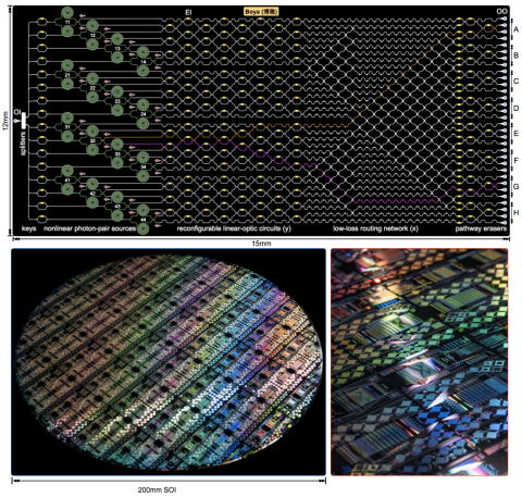 人工微结构和介观物理国家重点实验室“极端光学创新研究团队”王剑威研究员和龚旗煌教授课题组与合作者实现了一种基于图论的光量子计算芯片(命名为“博雅一号”),发展出了超大规模集成硅基光量子芯片的晶圆级加工和量子调控技术,首次实现了片上多光子高维度量子纠缠态的制备与调控,演示了基于图论的可任意编程玻色取样专用型量子计算。2023年4月6日,相关研究成果以“超大规模集成的图量子光子学”(Very-large-scale integrated quantum graph photonics)为题,在线发表于《自然·光子学》(Nature Photonics)。