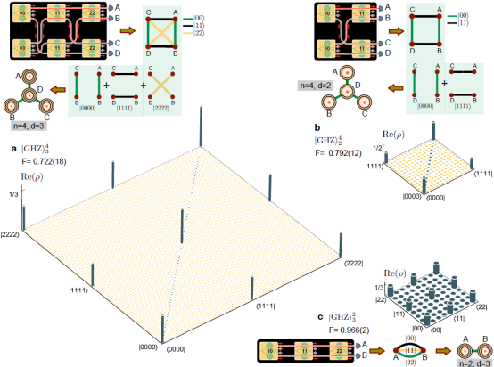 图2 图论光量子芯片上的多光子、高维度纠缠态制备与真纠缠验证