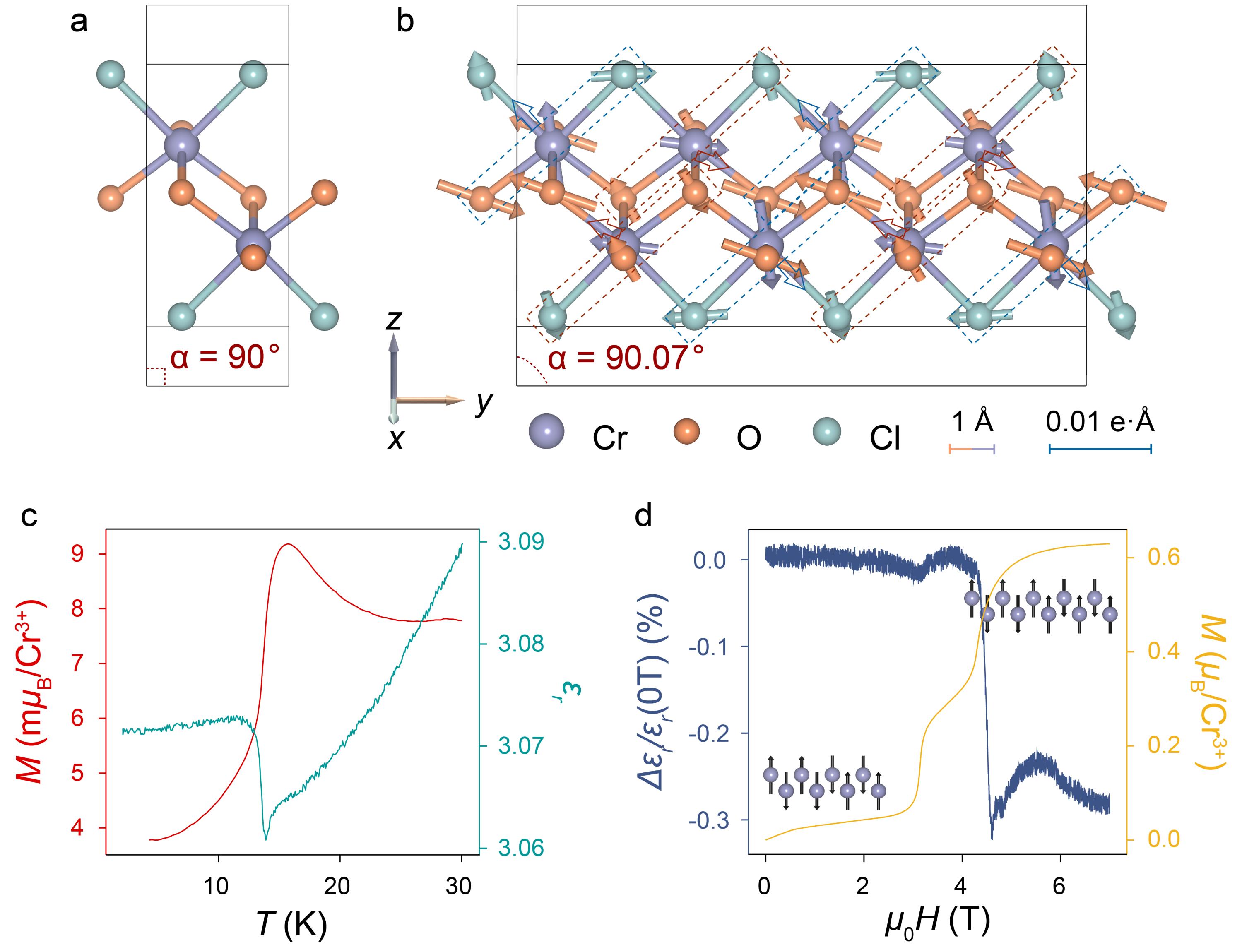 针对这一难题,叶堉课题组与合作者通过条状反铁磁中的磁电耦合效应,实现了二维极限下反铁磁相变的电调控。CrOCl是一种范德瓦尔斯层状条状反铁磁体,具有空气稳定、易于剥离等优势;而其低温下的条状反铁磁结构具有较低的磁对称性和晶格对称性,因此允许磁弹耦合、磁电耦合等多种能量耦合形式的存在。研究团队首先通过第一性原理计算提出,在低温下4b周期的两上两下条状反铁磁结构会诱导出2b周期的反铁电偶极矩。通过测量CrOCl的介电常数随温度、磁场的变化发现,在CrOCl的磁相变处其介电常数也随之发生了相变,这证实了低温下CrOCl中反铁电电偶极矩的出现,同时也证明了CrOCl是一个具有磁电耦合性质的材料(图一)。