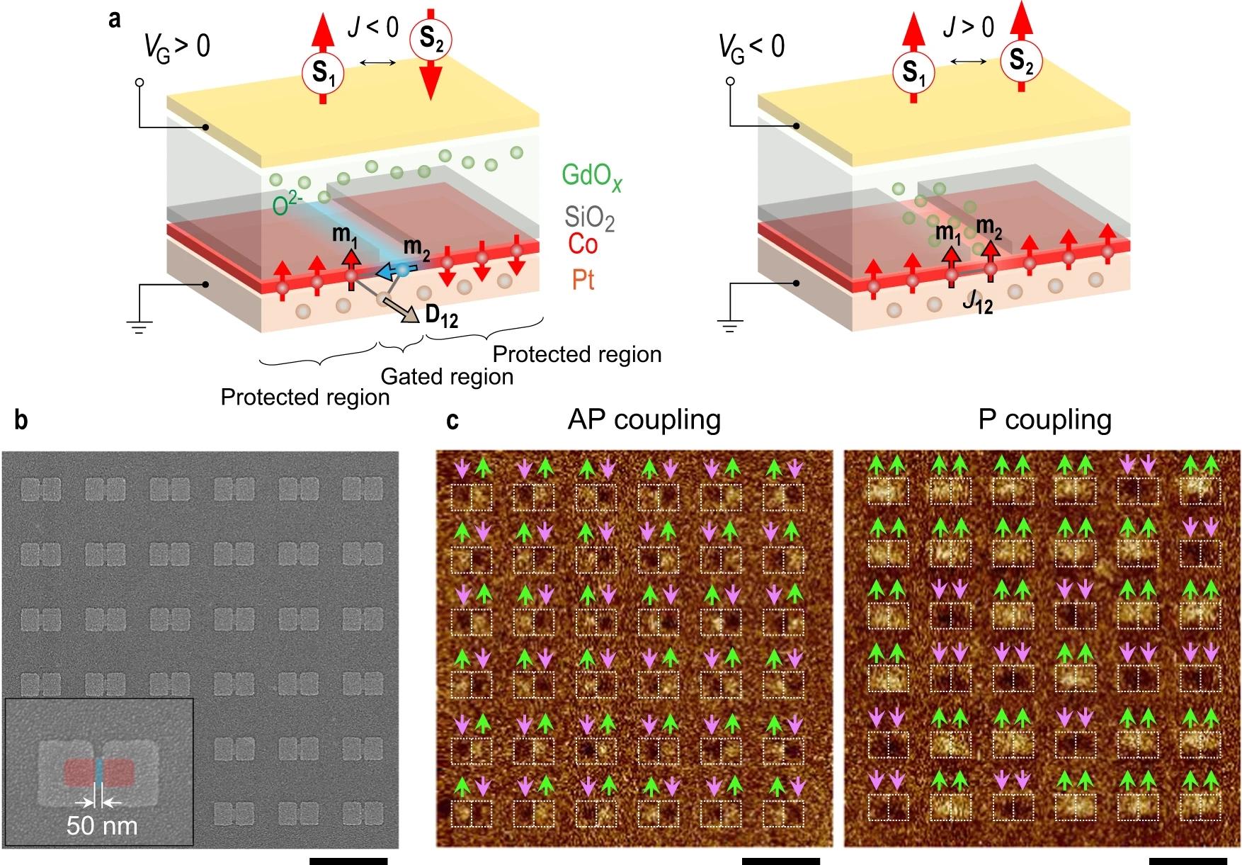 耦合纳米磁体系统示意图:a.电压调控反平行(左图)/平行(右图)耦合纳米磁体器件结构示意图;b.耦合纳米磁体电子显微镜图;c.耦合纳米磁体在反铁磁耦合(左图)铁磁耦合(右图)的磁力显微镜结果。