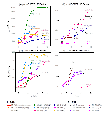 研究人员为了将二维场效应晶体管(2D FETs)缩小至极限尺寸,做出了巨大的努力,如图3所概括的。2016年,Desai等人首次实验实现了1纳米栅长的双层MoS2FETs,显示出约10-9mA μm-1的低漏电流,接近理想的65 mV/dec的亚阈值摆幅,以及约106的开关比。最近,清华大学的田禾课题组巧妙地利用了半金属单层石墨烯的边缘(0.34纳米)作为晶体管的栅极电极,实现了迄今最短的栅极长度(Wu, F., et al., Nature 2022)。其亚阈值斜率低至117 mV/dec,开关比达到1.02×105,漏电流小于10-9mA μm-1,满足IRDS对低功耗逻辑器件的要求。