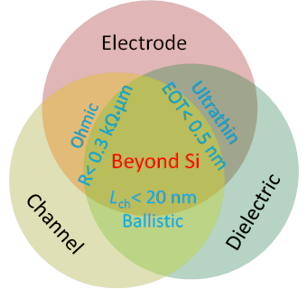 为了达到二维材料晶体管的理论极限,需要在缩短物理栅长和沟道长度、优化金属-二维半导体接触、减薄有效氧化物厚度等方面实现突破(图2),而对于集成电路而言,还需要与传统的硅基工艺集成。近期的一系列实验工作在这些方面均有重大进展,国内学者表现非常突出。这篇综述总结了二维晶体管的最新实验进展。