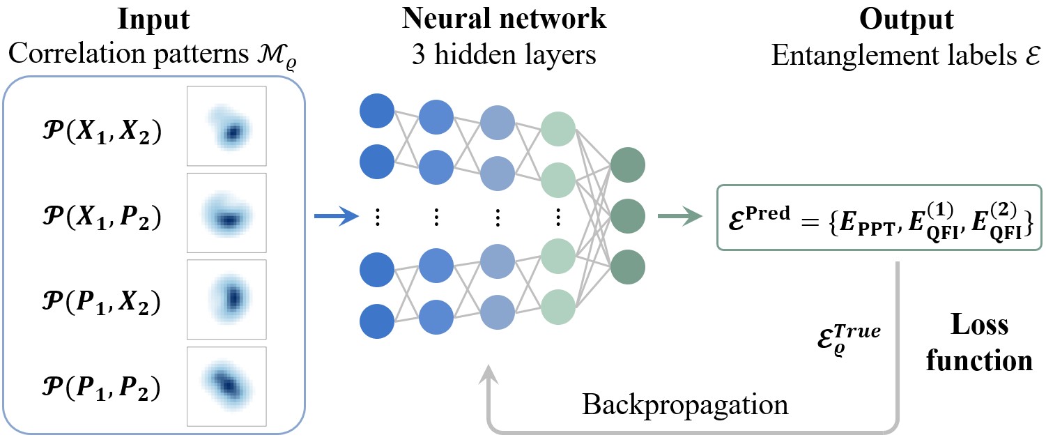 图1. 神经网络训练过程示意图。包含量子态纠缠特性的关联图像(Correlation patterns)与量子态纠缠判据计算结果(Entanglement labels)作为“特征-标签”对,被同时注入神经网络进行训练。神经网络内部参数通过多次反向传播(Backpropagation)迭代更新,最终建立起从关联图像到纠缠结果的映射关系。