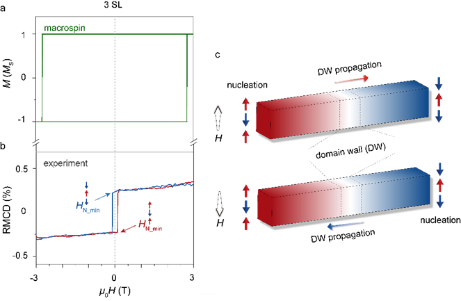图1. a-b一维线性链模型预测的3层MnBi2Te4未补偿净磁矩的翻转(a)和实验测量的RMCD磁滞曲线(b);c磁畴成核主导的自旋翻转。