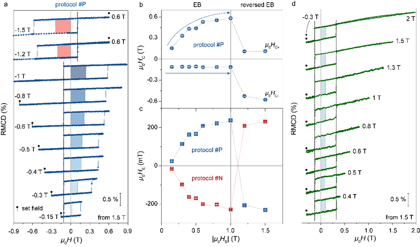图2. a仅需通过初始化磁场扫描(决定EB方向)和对向磁场扫描范围(HS)的设计,即可实现可控大小和方向的EB;b-c两种完全对称的磁场扫描方案下,实验中提取的HS依赖的磁翻转场和EB场演化。d初始化EB后,HS的反向场扫描范围将不对EB产生影响。