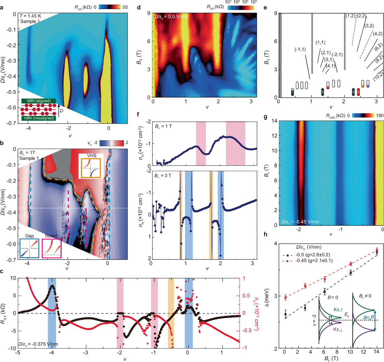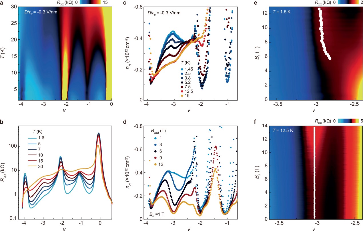 图四填充因子为-1和-2的区域,当电位移场较大时,电阻峰和载流子“重置”行为也有类似的温度和平行磁场依赖关系。