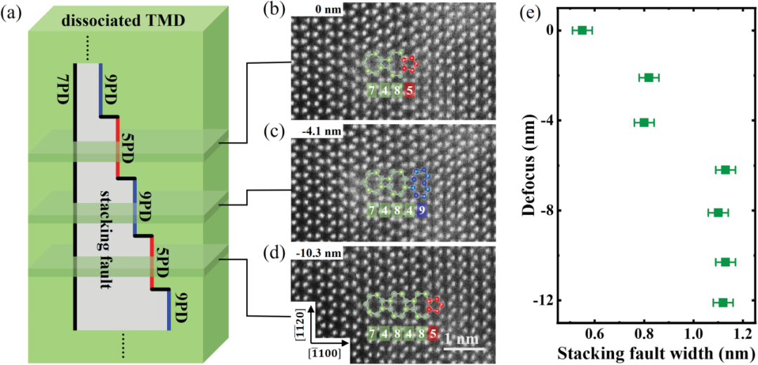 针对上述关键科学问题和应用需求,本实验室杨学林、沈波团队对氮化镓外延薄膜中位错的原子尺度攀移过程进行了深入研究。通过采用扫描透射电子显微镜(STEM)的深度切片技术,结合精心设计的外延结构调控位错攀移倾角,使其与STEM的深度分辨率精准匹配,成功捕捉到了单根位错线的原子级攀移过程,并发现混合位错中的5环不全位错以“5-9”原子环循环交替的方式进行攀移。在此基础上,合作单位北京计算科学研究中心黄兵团队利用模拟计算确认了位错割阶的原子结构和电子结构,并提出了“费米能级调控割阶形成”的新机制,为“掺杂如何影响位错攀移”这一问题的理解提供了全新的物理视角。
