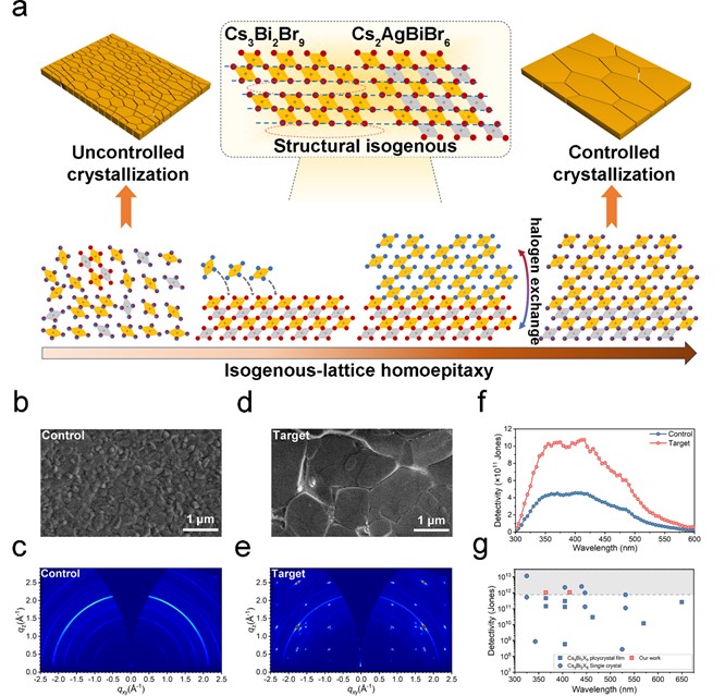 针对上述科学难题,研究团队借助于3D Cs2AgBiBr6和2D Cs3Bi2X9之间的结构同源性,开创性地采用结晶有序的3D Cs2AgBiBr6诱导2D Cs3Bi2X9定向外延生长。3D Cs2AgBiBr6前体的加入使得2D Cs3Bi2X9结晶更为有序,同时结晶过程中的卤素交换过程显著延缓,进而获得平均尺寸超过1μm,晶体取向高度一致的多晶薄膜(图1)。在紫外光下的探测度达到1.06 × 1012 Jones,与单晶器件的性能相当。该方法克服了低维非铅钙钛矿结晶质量较低的问题,为这些材料在先进光电器件中的应用提供了有价值的见解。这种独特而直接的方法也为其他材料的高质量多晶薄膜的快速制备提供了指导。