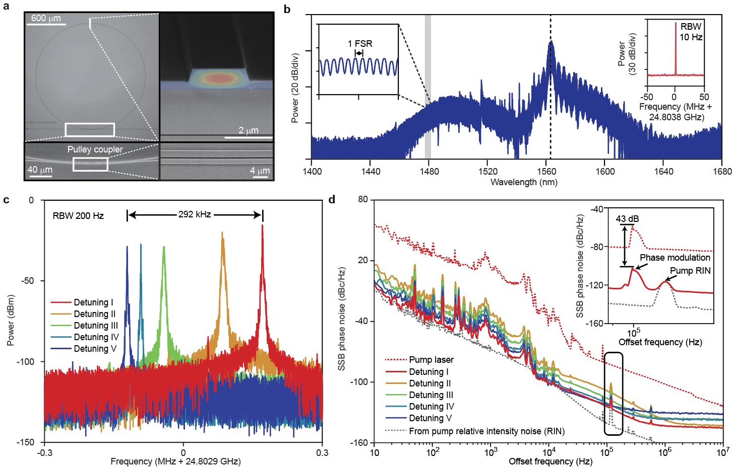 图2 暗脉冲光梳性能表征。(a) 微环的电镜图像。(b)暗脉冲微梳光谱。(c)不同失谐下的重频拍频信号。(d) 暗脉冲微梳重频的单边带相位噪声。