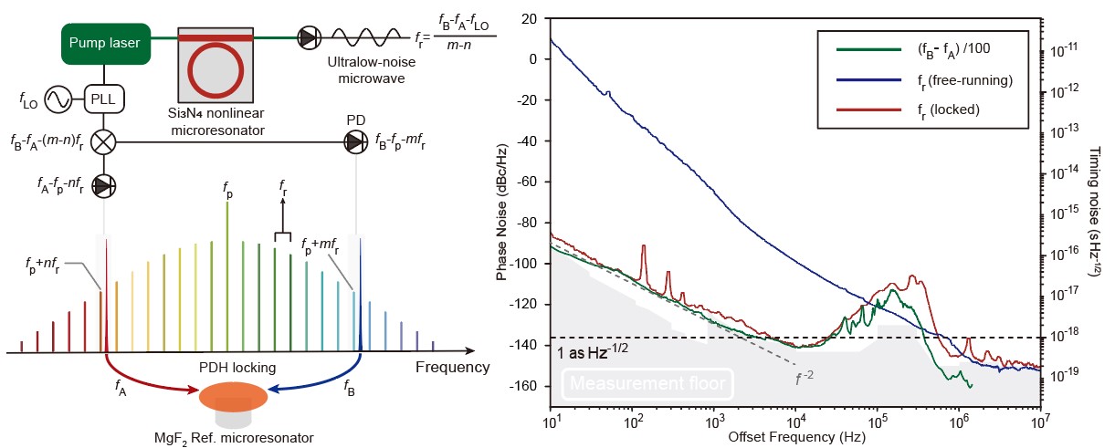 近日,人工微结构和介观物理全国重点实验室“极端光学创新研究团队”杨起帆研究员和龚旗煌院士团队实现仄秒级(1仄秒=10-21秒)定时抖动噪声的光子学微波振荡器。2025年5月23日,相关研究成果以“微腔参考具有仄秒级定时抖动噪声的孤子微梳”(Microresonator-referenced soliton microcombs with zeptosecond-level timing noise)为题,发表于《自然·光子学》(Nature Photonics)。