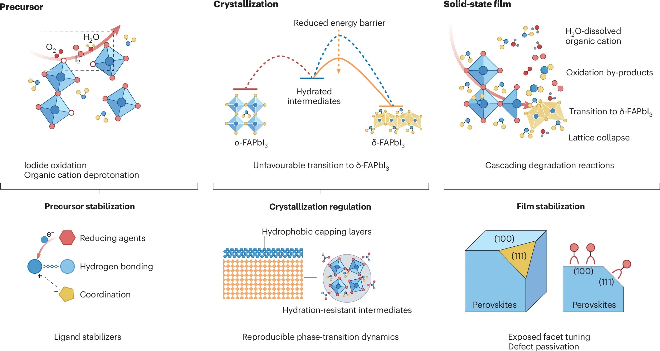在此基础上,团队细致总结评述了水分与氧气对于杂化钙钛矿材料制备的影响机制,包括前驱体化学、结晶动力学过程以及终相薄膜稳定性三个具体阶段,以深入分析水和氧气介导的钙钛矿结晶及降解路径(图1)。针对环境空气中制备钙钛矿薄膜的难题及其未来发展,认为应当重点关注:(1)不同于正置器件,倒置器件内部各界面的水氧吸附可能损害后续电荷传输层的沉积质量与能带结构,亟需深入研究不同界面水氧吸附造成器件性能损失的失效机制;(2)宽带隙钙钛矿薄膜的高质量沉积是叠层太阳能电池器件制备中的关键一环,开发新颖、耐水氧侵蚀的X位点拟卤素组分,或是基于纯相X位点调节混合A位组分实现目标带隙,构建类似常规带隙钙钛矿中应用的抗水氧表界面微结构,是潜在的优化途径;(3)在环境空气中进行大面积钙钛矿太阳能组件的制备面临着独特挑战,使用蒸发法与溶液法相结合的混合涂布工艺有望协同提升薄膜均匀性以及对于环境气氛制备的适应性。当前亟需开发可规模化的高光谱成像等表征技术,用于大尺度范围下的结晶过程监测与优化。此外,人工智能与高通量自动化技术的结合有望高效筛选器件制备条件,加速环境气氛制备方案迭代与反向预测,有效提升研发效率与成本效益。