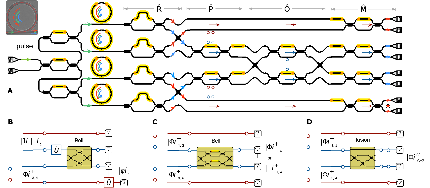 A. 硅基量子隐形传态和多光子量子纠缠芯片的示意图,左上角为集成量子光源的电子显微镜图;B. 量子隐形传态的量子线路图;C. 量子纠缠互换的量子线路图;D. GHZ纠缠制备的量子线路图