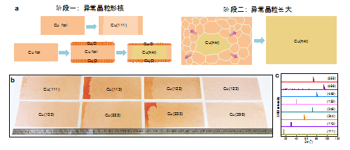 铜在现代信息社会中发挥着极为重要的作用,被广泛应用于电气、电子、通信、国防等关键领域。然而,目前市场上的商业用铜基本上都为多晶铜,其中存在的各种缺陷致使电子、声子输运效率大幅降低。理论上,具备完美晶体结构的单晶铜可将铜的本征电学和热学性能发挥到极致,预期会在低损耗、高散热的电力、电子器件应用方向产生重要影响。另外,近年来随着二维材料研究的兴起,铜被广泛应用于二维单晶材料的外延制备。具备各种指数晶面的单晶铜箔衬底是实现不同结构二维单晶材料外延生长的基础。因此,制备大尺寸、多种指数晶面的单晶铜箔是产业界、科研界亟待解决的科学和技术问题。