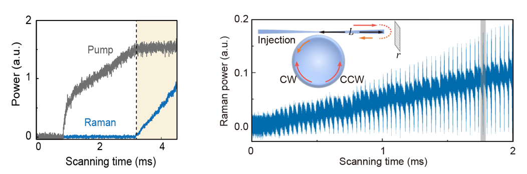 回音壁微腔中相向传播的行波模式可以相互耦合形成一对光学超模;基于这一体系,课题组首次实验证明了超模拉曼激光的单模特性。他们首先产生了低阈值超模拉曼激光,然后利用分插耦合结构直接观测腔中泵浦光场的能量,从而证明了超模拉曼激光中的增益钳制效应。随后,采用外差干涉方法,进一步测得激光的边模抑制比超过30 dB,有力地证实了其单模特性。为了探索拍频现象的物理来源,采用激光自注入方法,将输出的部分拉曼激光再次耦合进入微腔并与反方向的光场干涉,从而动态调控两个光学超模的损耗。此时,时域上的拉曼出射激光出现以往实验中观察到的周期性拍频信号。研究人员结合理论计算分析,解释了拍频信号来源于两个激射模式交替过程中的动态干涉,而非稳定的双模激射。该项工作为基于微腔激光器的高灵敏光学传感提供了有效指导,同时也有望在片上可重构光源和低损耗光学存储器等应用中发挥重要作用。