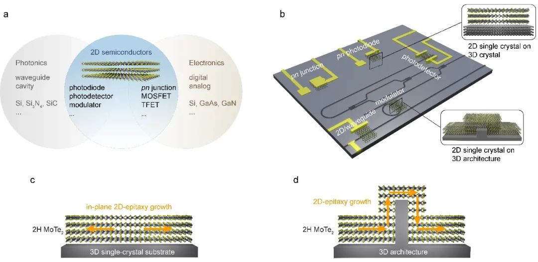 图1 在平面单晶材料和三维形貌结构上直接合成二维半导体2H-MoTe2薄膜的异质光电集成示意图