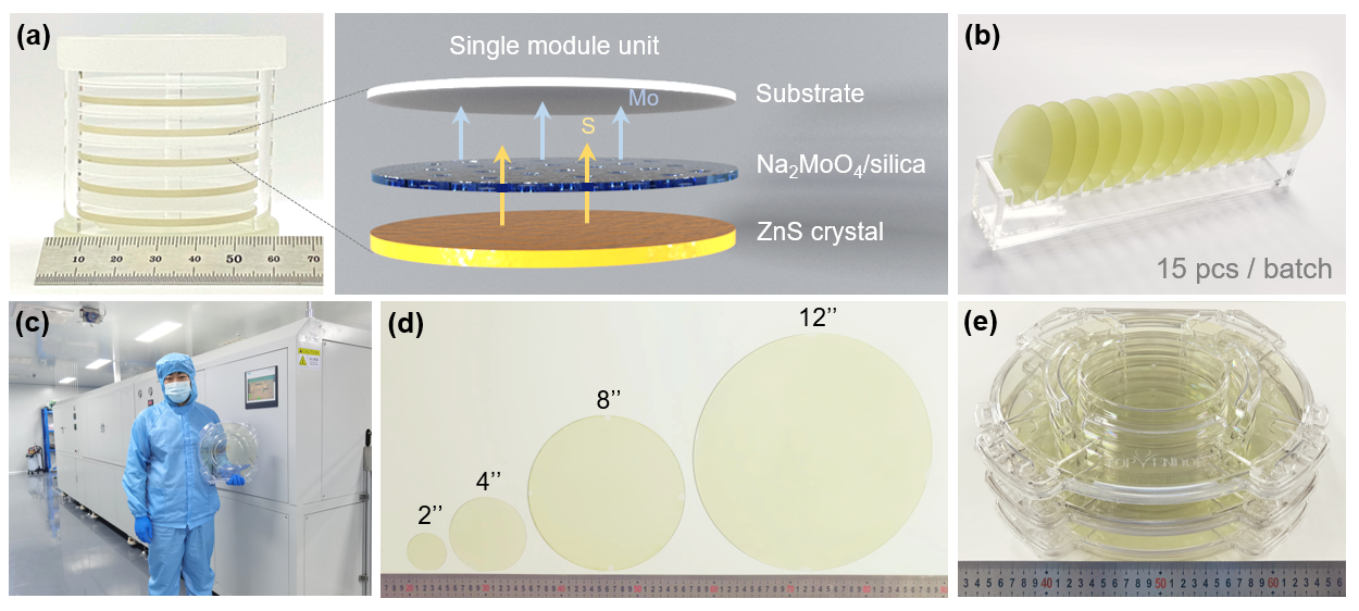 a. 过渡金属硫族化合物晶圆批量化制备装置及示意图;b. 单批次制备15片2英寸MoS2晶圆;c. 350-mm管径自动控制化学气相沉积管式炉;d. 2-12英寸MoS2晶圆照片;e. 单批次制备3片12英寸MoS2晶圆。