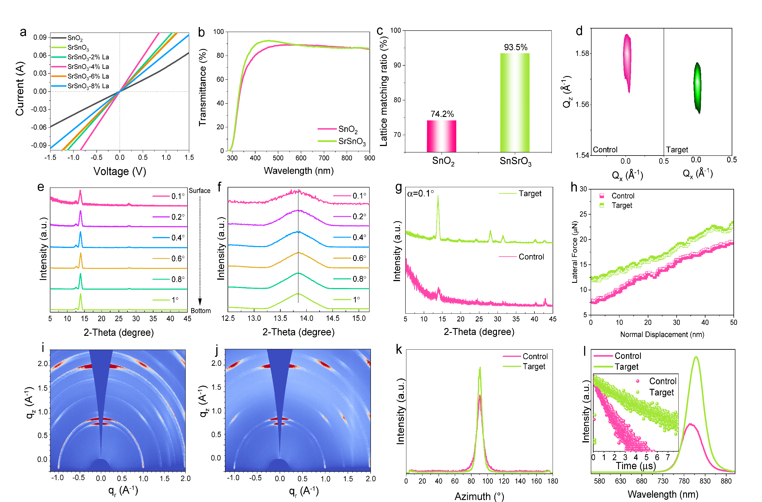 图2.更有序的起始结晶构建良性埋底界面。a,ITO/SnO2或La-SrSnO3/Au结构的器件的电流-电压曲线表明掺杂4%La的SrSnO3具有最高的电导率。b,SnO2和SrSnO3的透光率曲线。c,SnO2与吸光钙钛矿、SrSnO3与吸光钙钛矿的晶格匹配率。d,在暴露的control和target埋底界面上(001)面进行的RSM表征结果。e,不同入射角下target薄膜的GIXRD结果。f,图4e中放大的(001)面。g,在入射角为0.1°的control和target样品埋底界面的GIXRD结果。h,基于暴露的control和target埋底界面的纳米划痕测试。i-k,暴露的control和target埋底界面的GIWAXS结果。l,control和target埋底界面的PL和TRPL结果。