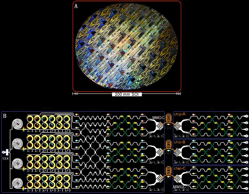在该项研究工作中,研究团队发展了片上多维混合复用量子调控技术,采用互补金属氧化物半导体(CMOS)制造技术自主研制了可大规模制造且具有晶圆级高一致性的硅基集成光量子器件与芯片,构建了多芯片高维量子网络。同时,提出和发展了一种高维量子纠缠自修复方法,可快速恢复在复杂介质中传输时已退化的高维纠缠,最终实现了多个光量子芯片间的高维量子纠缠相干分发功能。