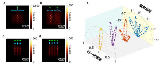 图5.相控阵纳米激光阵列。(a-d)基模(a)、一阶模(b)、二阶模(c)、三阶模(d)的实空间激射图案,标“+”和“−”的纳米激光之间相差180度的相位;(e)基模、一阶模、二阶模、三阶模中心Г点的角分辨强度分布图。