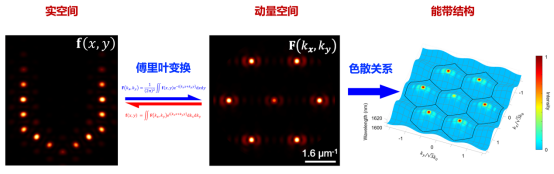 图2.莫尔平带的本征能量简并特性使得任意形状纳米激光阵列的相干激射成为可能。纳米激光阵列的实空间和动量空间电场强度分布由傅里叶变换相互联系,动量空间分布通过能带结构对应出频率分布,莫尔平带保证了频率的简并性。