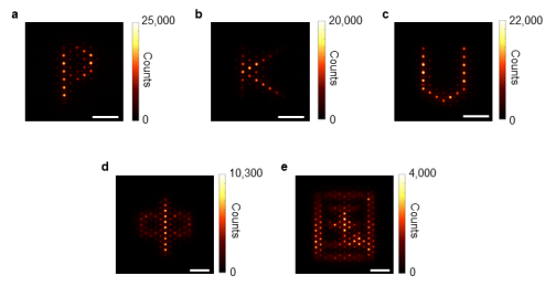 图3.莫尔纳米激光阵列以“P”、“K”、“U”和“中”、“国”图形生成阵列化相干激射。由于莫尔平带的本征能量简并特性,任意形状的莫尔纳米激光阵列均能够通过自发相位锁定产生相干激射。图中标尺均为10微米。