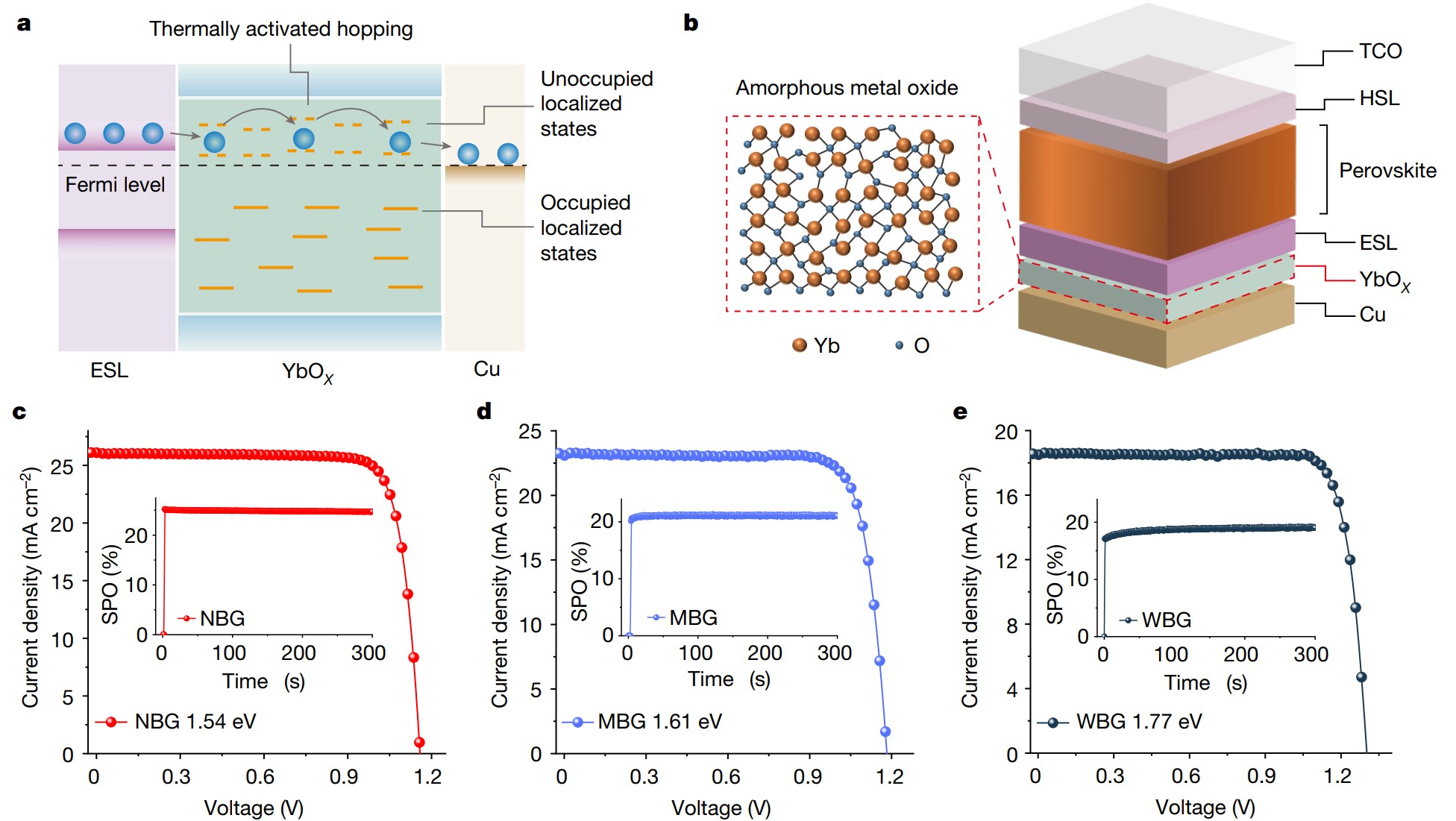 图2:载流子输运机理和太阳能电池性能。(a)载流子在电子传输层/α-YbOx/Cu界面的输运示意图;(b)钙钛矿太阳能电池结构示意图;(c-e)基于不同带隙钙钛矿的太阳能电池性能。