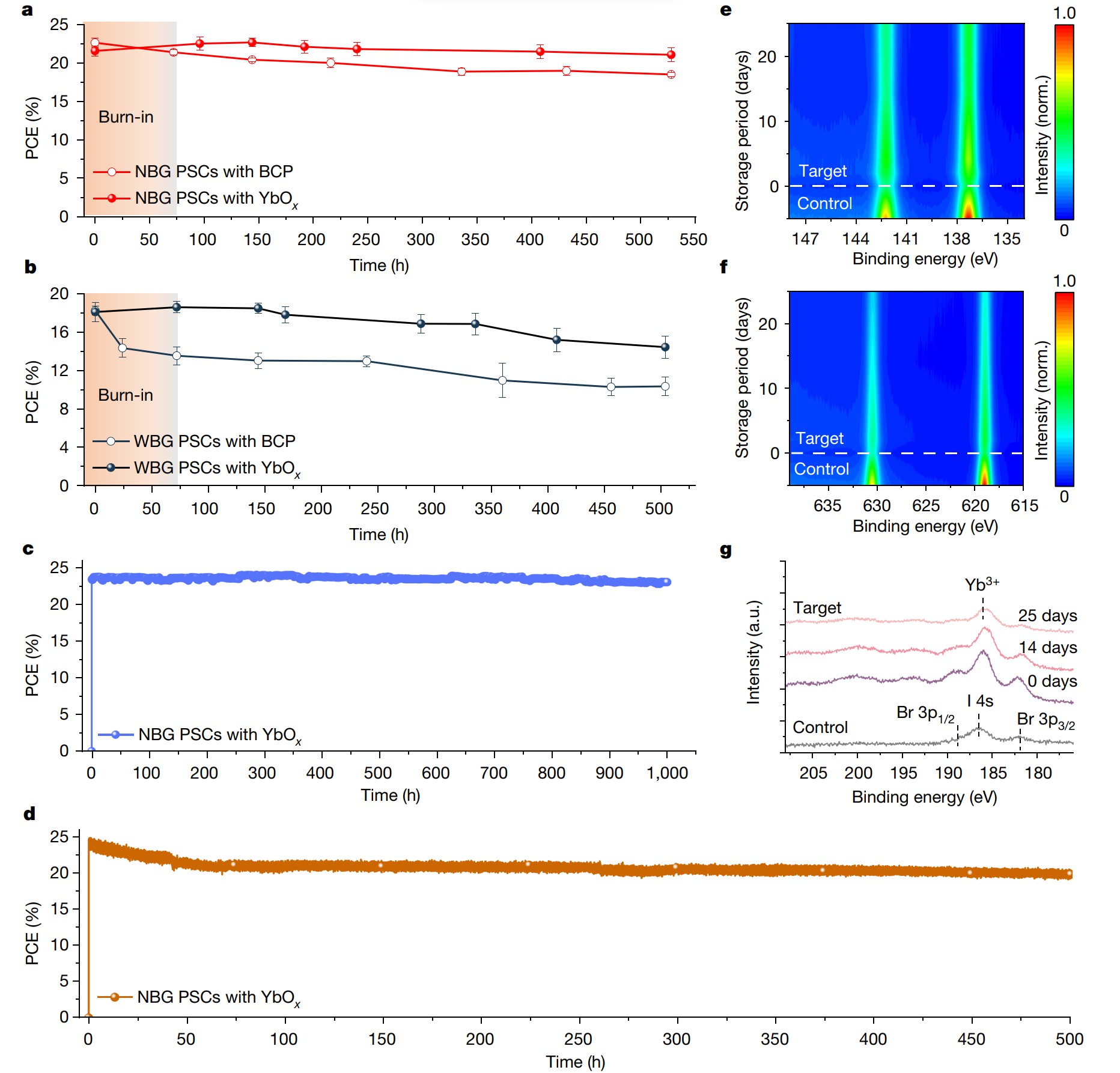 图3:钙钛矿太阳能电池的稳定性。(a-b)基于不同界面缓冲层的窄带隙和宽带隙钙钛矿太阳能电池的热稳定性对比(85°C);(c)基于α-YbOx界面缓冲层的窄带隙钙钛矿太阳能电池运行稳定性;(d)在ISOS-L-3标准下,基于α-YbOx界面缓冲层的窄带隙钙钛矿太阳能电池运行稳定性;(e-f)纯钙钛矿薄膜(Control)和钙钛矿/α-YbOx(Target)界面的X射线光电子能谱随时间变化。