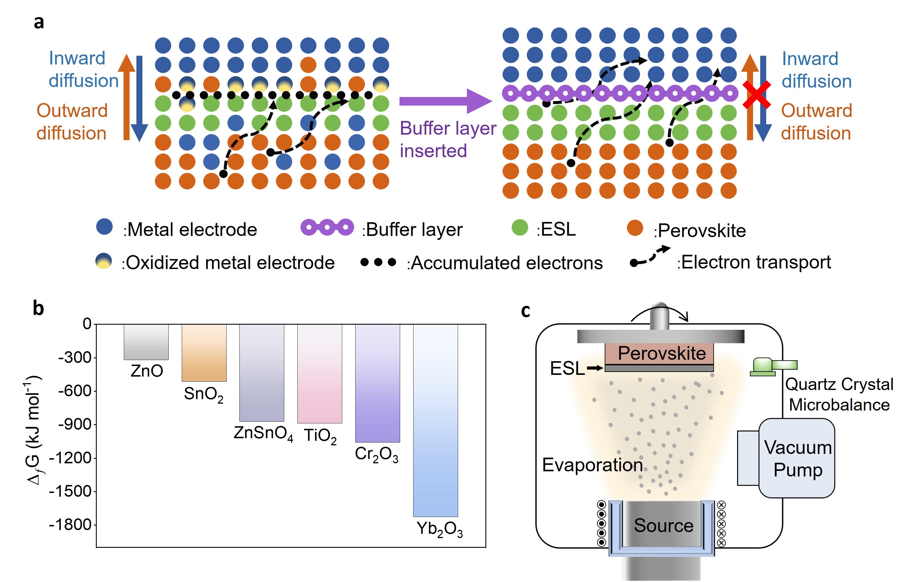 在“双碳”战略目标背景下,新型钙钛矿太阳能电池是清洁能源研究的重要方向。然而,钙钛矿太阳能电池界面存在严重的物质扩散与离子迁移,这使得电池光电转换效率和工作稳定性受限。通常,可以通过在电荷传输层与金属顶电极之间的界面引入多功能缓冲层来缓解上述难题。目前,这类多功能缓冲层主要为有机半导体浴铜灵(BCP)或金属氧化物氧化锡(SnOx)。然而,BCP存在热稳定性不佳的问题;SnOx则需要采用原子层沉积(ALD)技术,制备耗时长且前驱体价格昂贵。因此,亟需开发稳定性突出、工艺简单且电荷输运特性良好的新型界面缓冲层材料。鉴于此,研究团队基于对非晶态金属氧化物半导体材料的特性认知,结合材料氧化动力学和物化性质(电子结构、吉布斯自由能等)的综合分析,最终选定了可用物理气相沉积制备的α-YbOx来构建反式结构钙钛矿太阳能电池电子传输层/金属电极间的界面缓冲层(图1)。