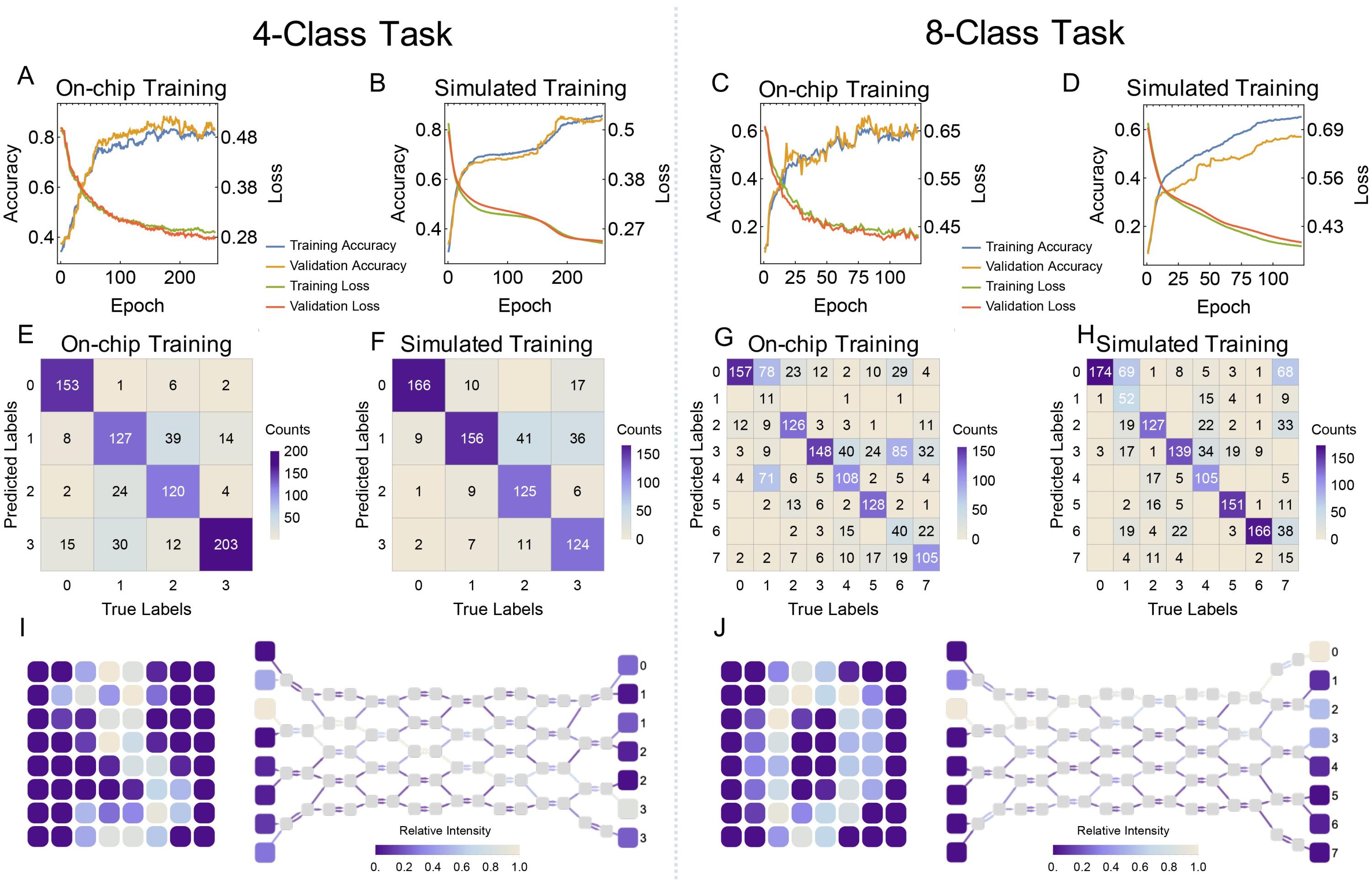 图4.片上光学神经网络实现MNIST手写数字分类。(A-B)四分类片上训练和计算机模拟的准确度和损失函数随训练代数的关系。(C-D)八分类片上训练和计算机模拟的准确度和损失函数随训练代数的关系。(E-F)四分类片上训练和计算机模拟的测试集的混淆矩阵。(G-H)八分类片上训练和计算机模拟的测试集的混淆矩阵。(I-J)数字“3”和“0”输入到芯片上时,光强在平台上分布的演化过程。