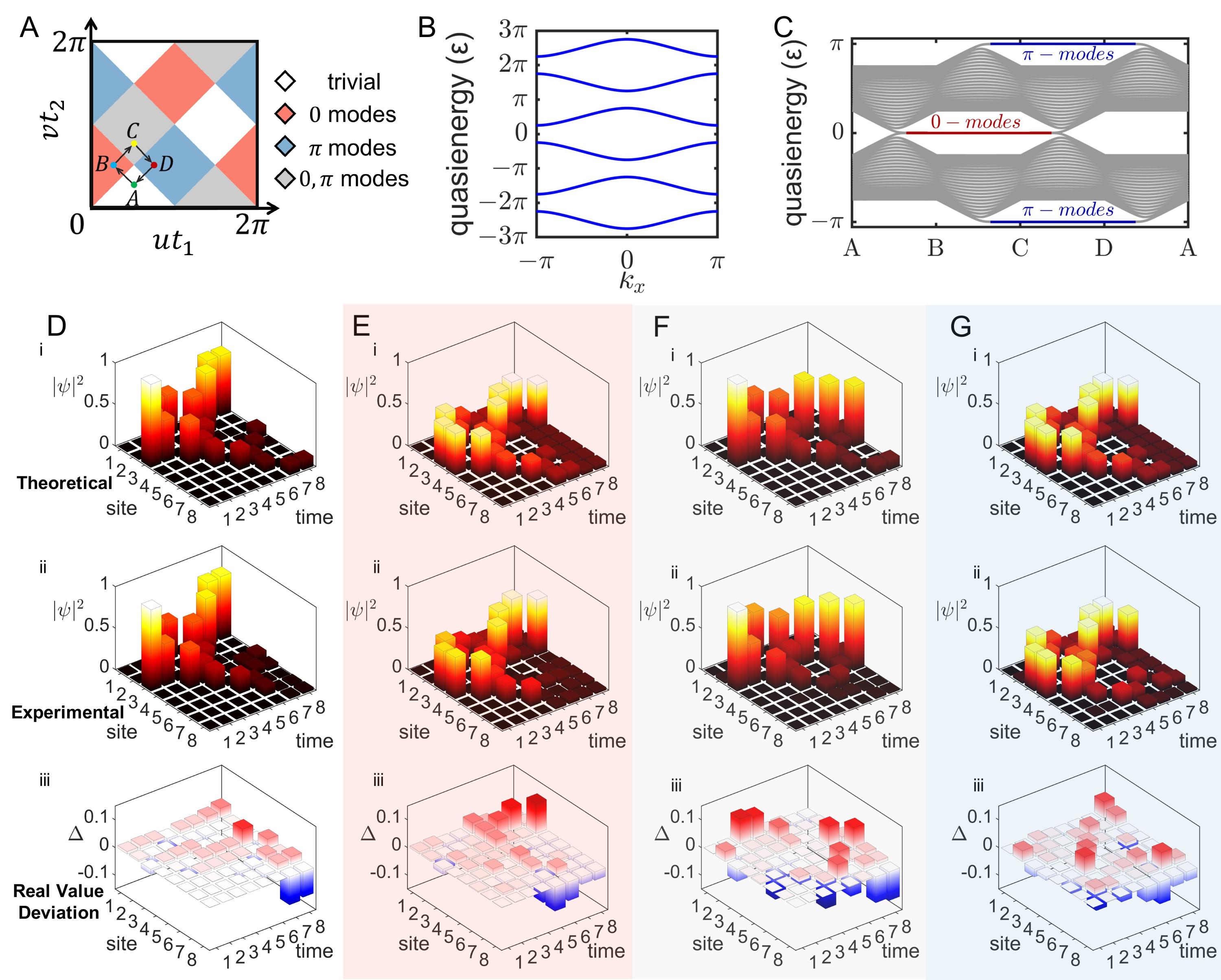 图2.一维弗洛凯SSH模型量子模拟结果。(A)一维弗洛凯SSH模型拓扑相图。(B)一维弗洛凯SSH模型在周期性边界条件下的准能谱。(C)一维弗洛凯SSH模型在开边界条件下的准能谱。平庸(D)、拓扑0模(E)、拓扑π模(F)、以及拓扑0模π模同时存在(G)这四种拓扑相下量子态的演化过程。