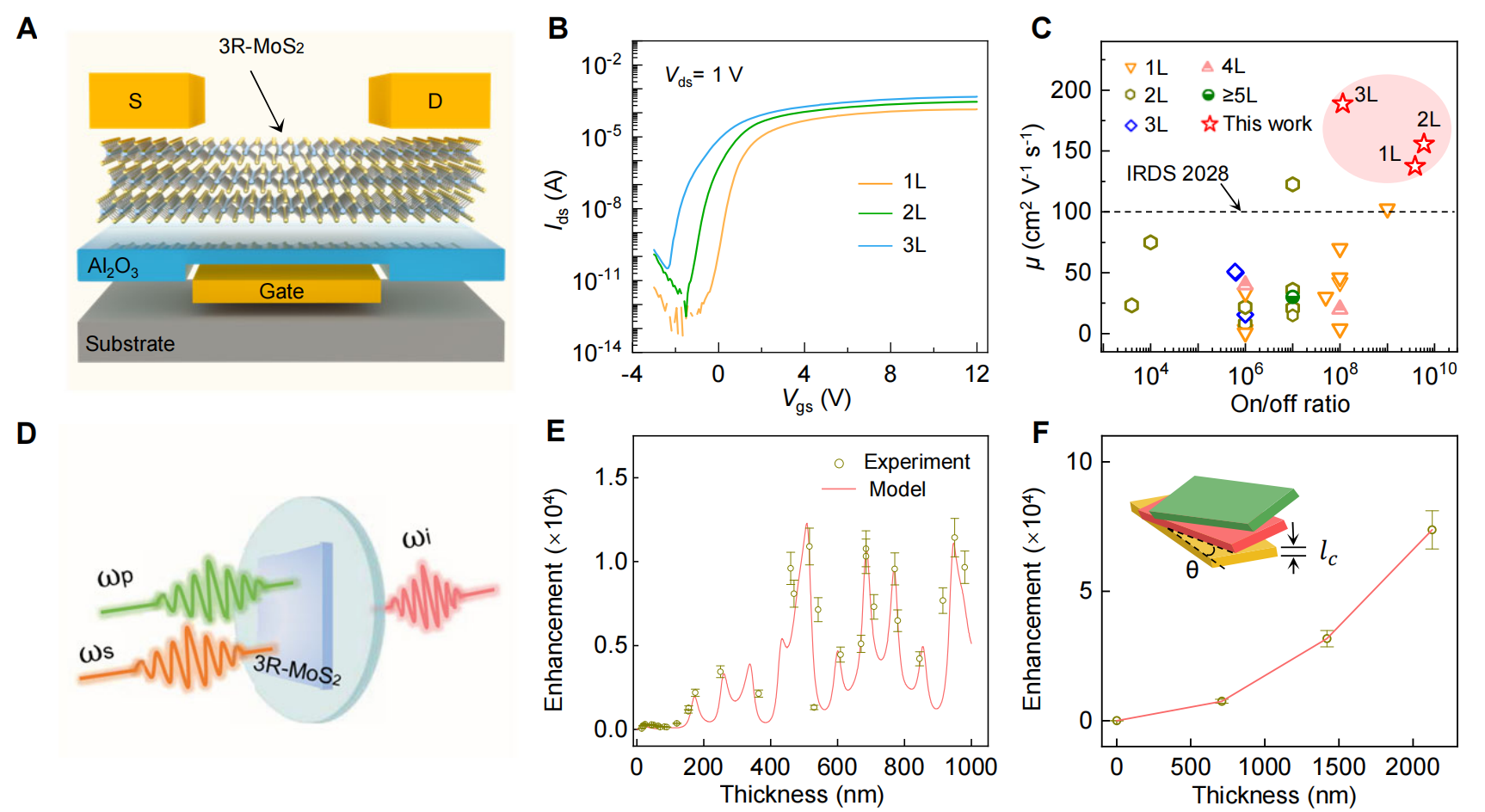 针对上述挑战,刘开辉课题组与合作者提出“晶格传质-界面外延”材料制备新范式,首次实现了层数及堆垛结构可控的菱方相3R-TMDs单晶的通用制备。为了克服金属衬底的硫化反应,该研究通过将硫族元素以单原子供应方式充分溶解至Ni-M(M为过渡金属)合金衬底中,反应原子通过浓度及化学势梯度于金属晶格中不断传质,随后在衬底和TMDs界面处外延析出新生TMDs层。通过连续“抬起”形成层来保持外延界面的表面结构及化学活性,保证了每层TMDs沿衬底台阶的平行取向,“推动”了多层薄膜的连续界面外延,实现了15000层以内的层数可控、层间严格平行排布的晶圆级单晶3R-TMDs(含MoS2、MoSe2、WS2、WSe2、NbS2、NbSe2及MoS2(1-x)Se2x)纯相生长。其中,少层3R-MoS2展现了极高的电学性能,满足国际器件与系统路线图2028年半导体器件迁移率目标要求;厚层3R-MoS2在非线性频率转换方面展现出卓越的性能,在准相位匹配条件下,实现近红外波段高能效差频转换效率,较单层提升5个数量级。该工作发展了“晶格传质-界面外延”材料制备新范式,有望推动新一代电子芯片及光子芯片技术应用。