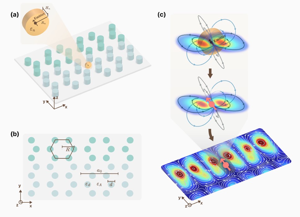 图2 (a)拓扑光子晶体—共振纳米圆盘复合结构示意图。(b)蜂窝光子晶体结构示意图。(c) 由磁量子发射器(棕色箭头)激发的纳米盘的磁偶极子共振可以等效成大磁偶极子(粉色箭头)。 纳米盘和等效磁偶极子周围的流线是磁场线。 底部是边缘态的电场分布,白色流线是磁场线。