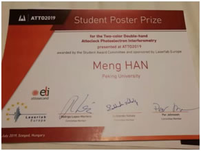 2019年7月1日至7月5日,在匈牙利塞戈德举办的国际阿秒科学大会(ATTO2019)上,北京大学物理学院现代光学研究所,人工微结构和介观物理国家重点实验室博士生韩猛同学获得最佳学生海报奖(Student Best Poster Prize)。